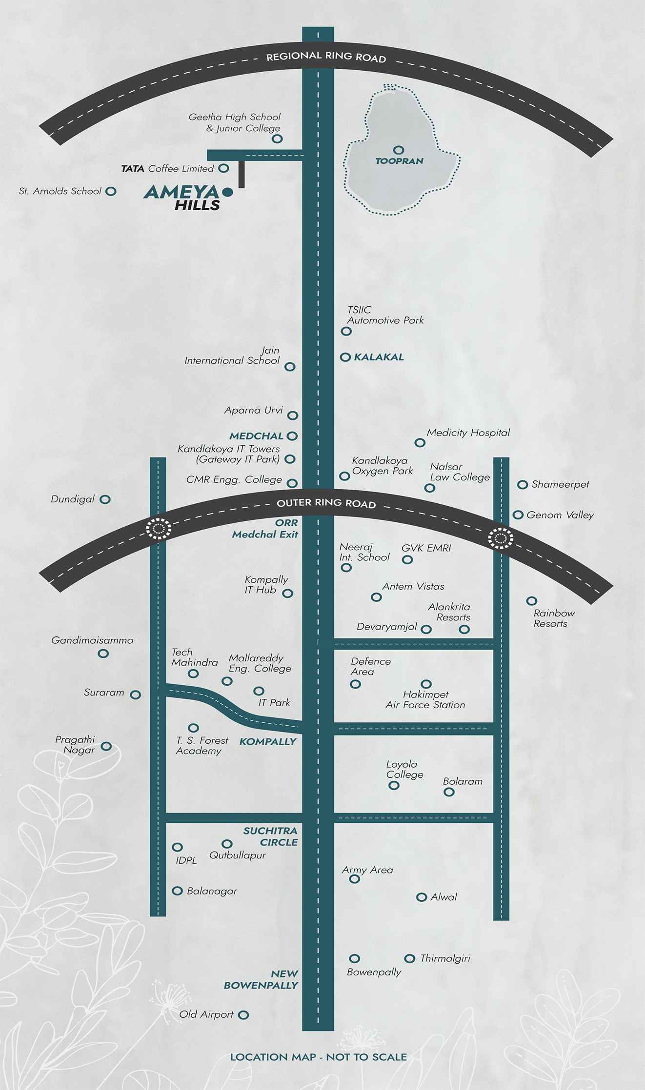 The project holds valid RERA approval (Registration No. P02200003098), ensuring transparency and compliance with government regulations. Ameya Hills is strategically located near major infrastructure developments like the Outer Ring Road (ORR), NH-44, and the proposed Regional Ring Road (RRR), making it highly accessible for both residential living and future appreciation in value. With premium amenities and a nature-friendly environment, Ameya Hills is positioned as a desirable destination for villa-style living just outside the bustle of Hyderabad.