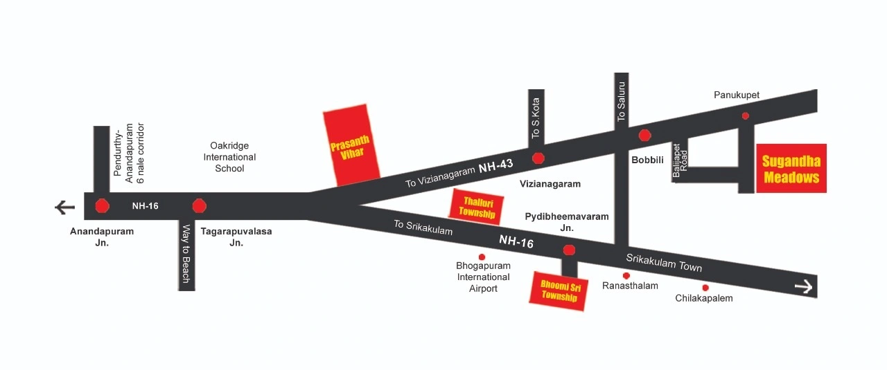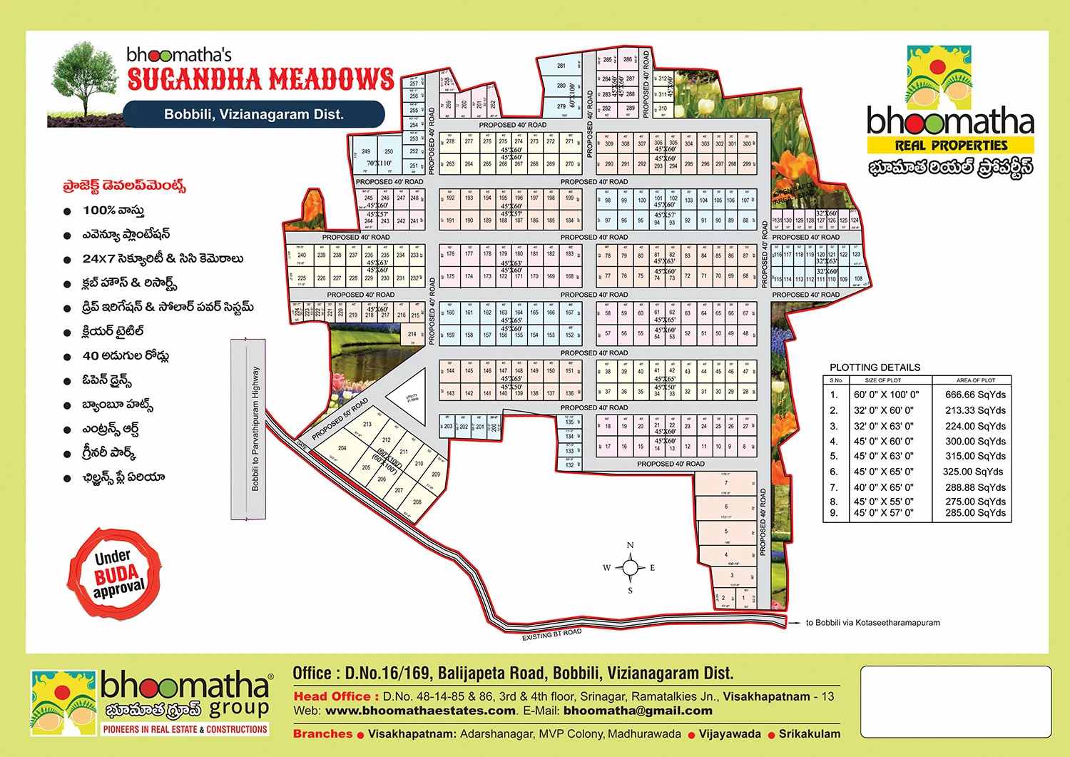 Bhoomathas Sugandha Meadows offers 312 VMRDA-approved plots, designed to suit modern lifestyle needs. Spread across a well-developed layout, plot sizes range from 213 Sq.Yds to 666 Sq.Yds, offering ample space for your dream home or long-term investment.