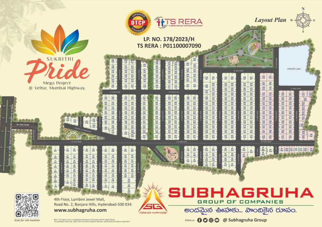 Sukrithi Pride by Subhagruha is a residential plotting venture located in Veltur, Hyderabad. Spanning across 70 acres, the project offers 378 well-developed residential plots that are thoughtfully planned to provide a comfortable living environment. With plot sizes ranging from 158 sq. yds to 367 sq. yds, it caters to a variety of buyers, whether looking for compact residential spaces or larger plots for spacious homes.