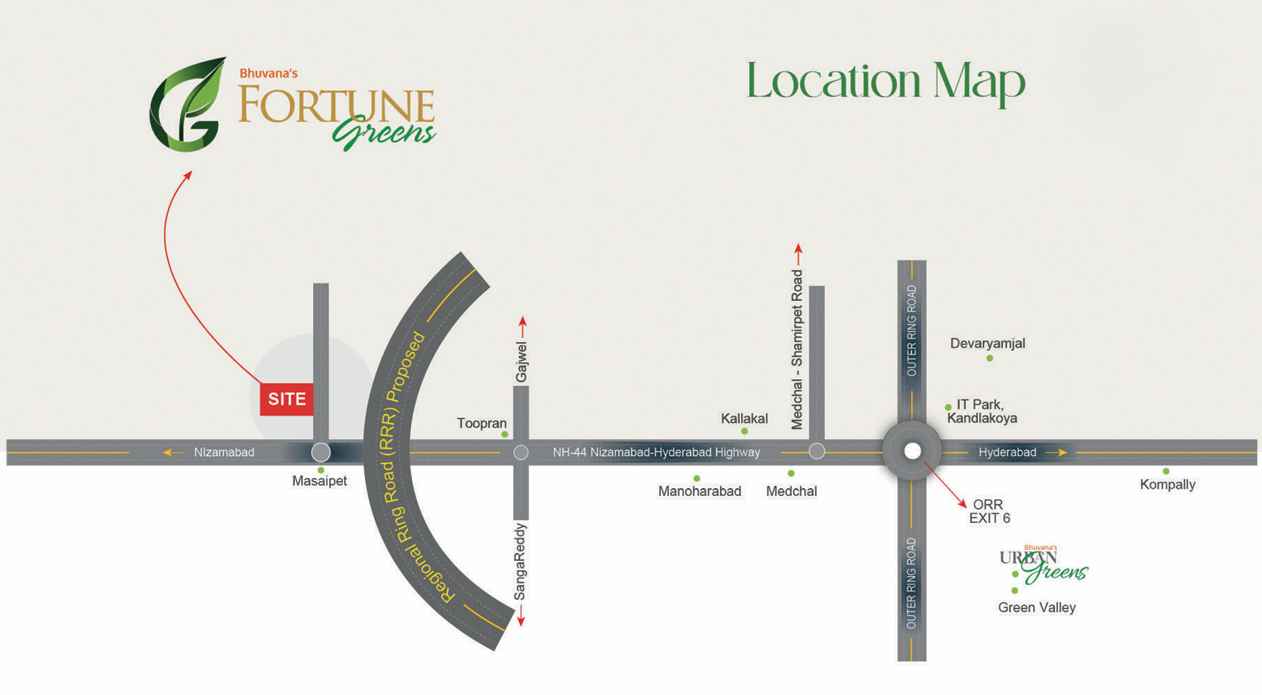 The villas are crafted to suit the lifestyle needs of both small and large families, ensuring spacious designs and a balanced mix of functionality with aesthetics. Its location in Masaipet offers residents a peaceful setting away from the city's chaos while still maintaining connectivity to Hyderabad’s essential hubs. This combination of modern living, open surroundings, and strategic location makes Bhuvana Fortune Greens an appealing option for homebuyers seeking long-term value.