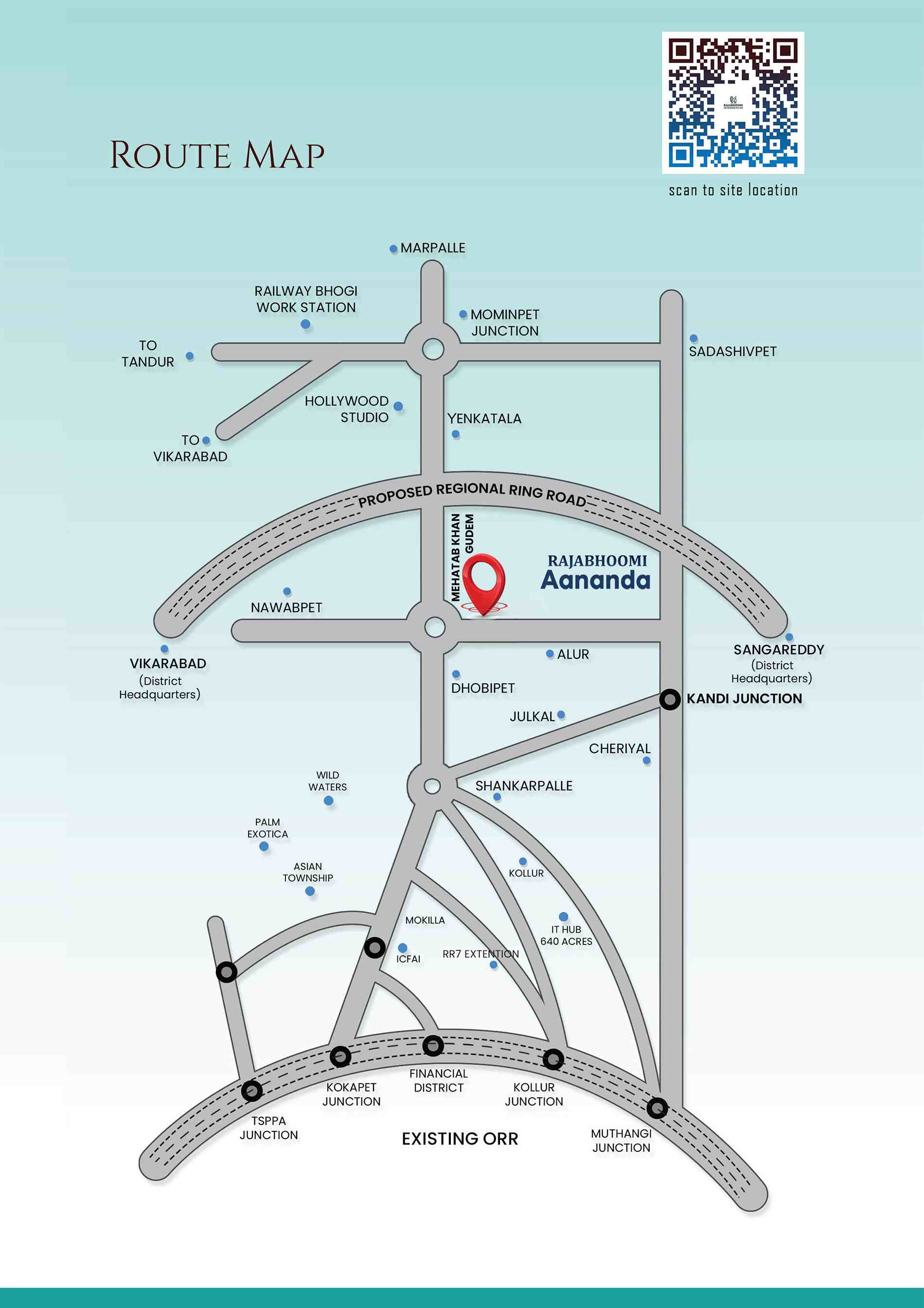 Rajabhoomi Aananda is a premium residential plotting venture spread across 15+ acres of lush greenery, designed for those who value space, comfort, and a serene lifestyle. Located about 40 minutes from Kokapet and Neopolis Junction, it sits strategically within the emerging growth corridor of Mehtabkhanguda, Mominpet, and Vikarabad, one of Telangana’s most promising investment zones.