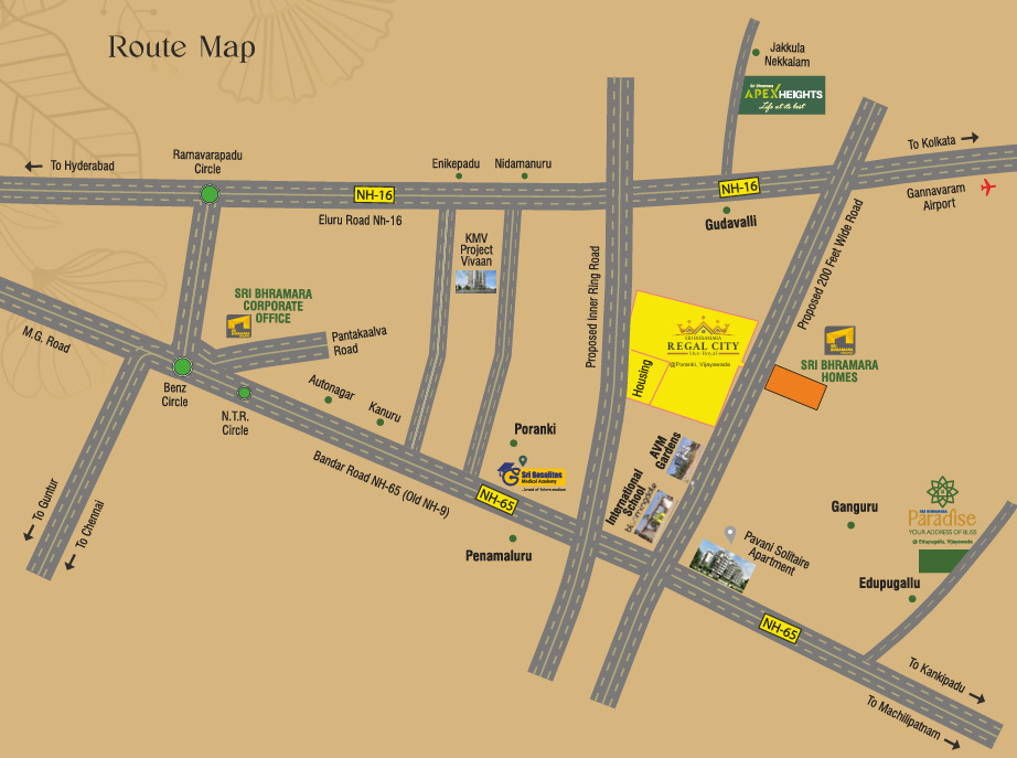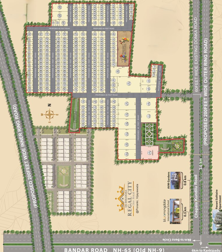 Sri Bhramara Regal City is a premium residential open plots project located in Poranki, Vijayawada. Spread across 20 acres, the layout features 216 well-planned plots designed for comfortable living. The project is developed as a secure gated community with organized infrastructure and clear plot demarcation. It enjoys excellent connectivity to key areas of Vijayawada and nearby growth corridors. Ideal for building your dream home, it also offers strong potential for long-term investment.